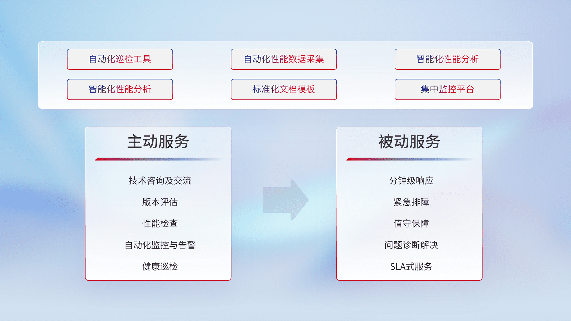 智能化工具和标准化文档,,,,保障服务质量,,提供主动服务(包含技术咨询、、、、版本评估、、、性能检查、、、自动化监控与告警、、、、健康巡检)和被动服务包含(分钟级响应、、、、紧急排障、、、、值守保障、、、问题诊断解决、、SLA服务)。。。